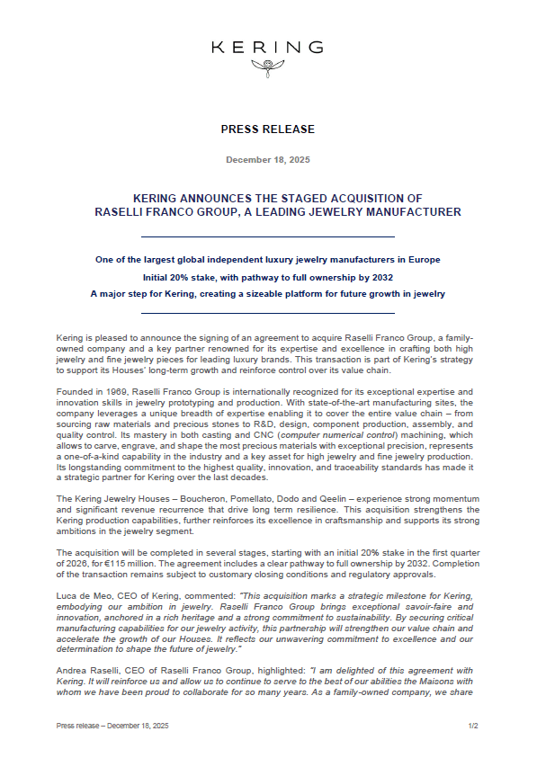 Kering is pleased to announce the signing of an agreement to acquire Raselli Franco Group, a family-owned company and a key partner renowned for its expertise and excellence in crafting both high jewelry and fine jewelry pieces for leading luxury brands. This transaction is part of Kering’s strategy to support its Houses’ long-term growth and reinforce control over its value chain.